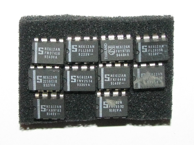 Vypreparovaných obvodů je nakonec deset. Jediný je Philips ("THAILAND"), ostatní Signetics, což je v podstatě totéž. Philips tuto značku spolknul už dávno, ovšem až do 90. let bývaly k mání integráče s "S" (zejména za velkou louží). Přeškrabaný NE612AN je z aparátu morgan's Tornado, přeškrabaný NE602N je ze stroje HUTH 136 CARAT. Krátce se o něm v mém poptávkovém tématu zmíním...