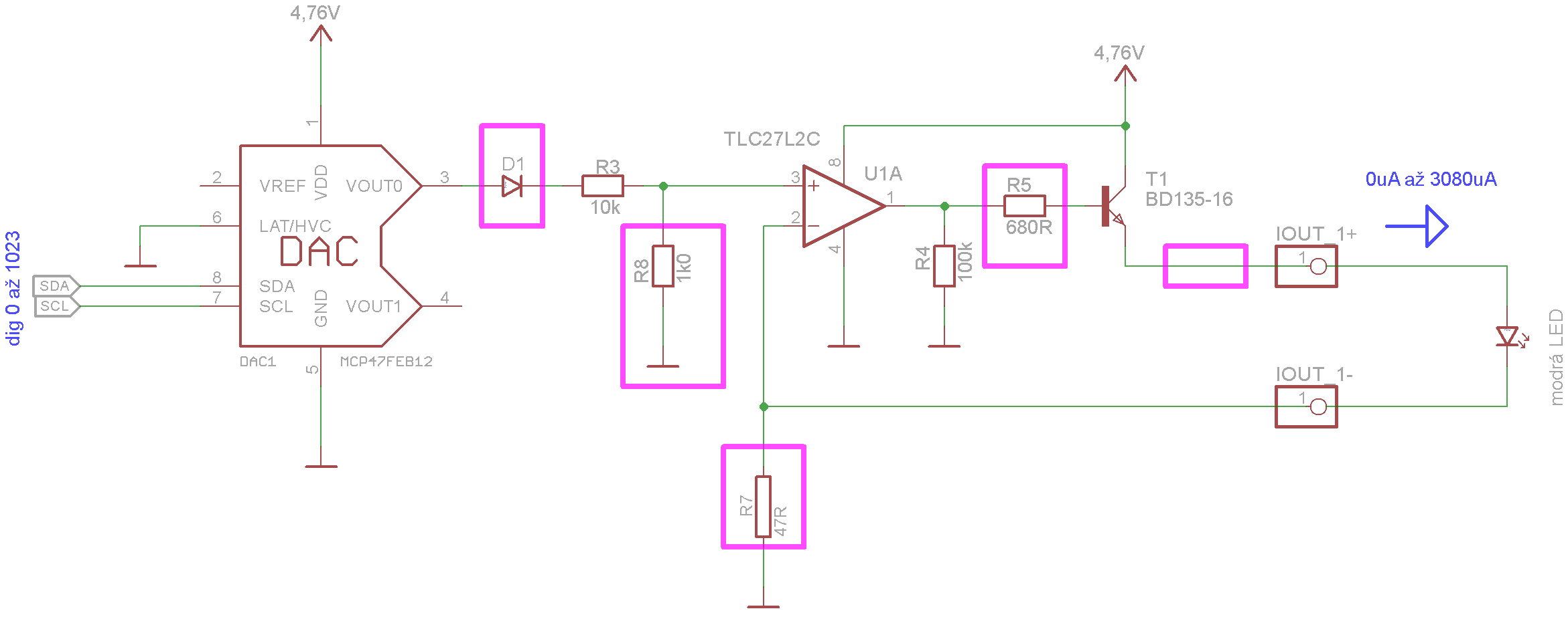 Za D/A převodník jsem dal operační zesilovač s tranzistorem, který by měl sloužit jako zdroj konstantního proudu (proud nezávislý na zátěži)