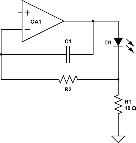 Ta bílá LED je docela zrada. Ta bude potřebovat OZ s rail-to-rail výstupem nebo zvednout napájení alespoň na 7V.