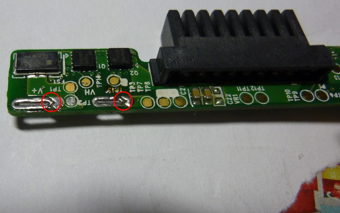 Postup opravy: Vyskladal som z ostávajúcich 4 funkčných článkov batériu, naletoval ako boli (začal som od záporného pólu a postupoval ku kladnému). Dve prerušenia zakrúžkované na obrázku som zatiaľ nechal rozpojené. Jednotlivé články som postupne nabil externou nabíjačkou doplna. Potom som zletoval tie dve prerušenia, najprv to v strede dosky, potom to na kraji.
