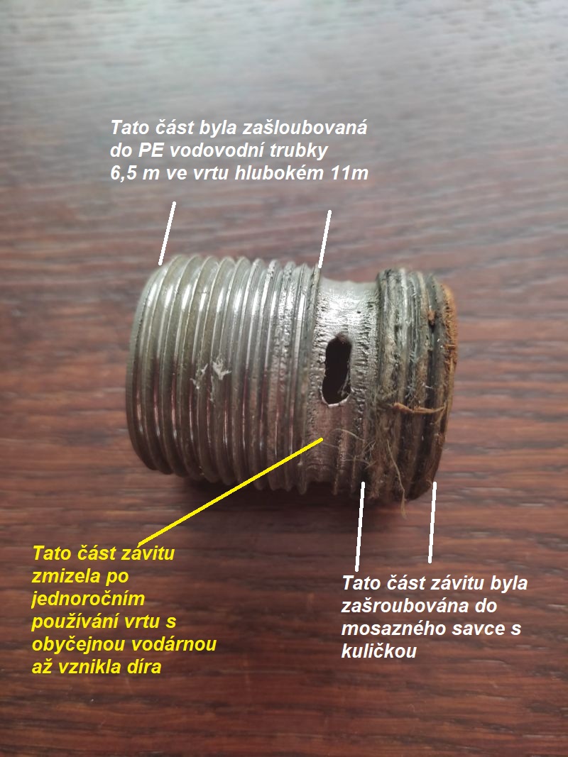 Nevím jestli došlo k nějaké elektrolýze na Fe šroubení, které spojovalo mosazný savec s PE trubkou ve vrtu 6,5 m. Nejde mi to na rozum, aby za rok ubylo tolik litinového materiálu ?!