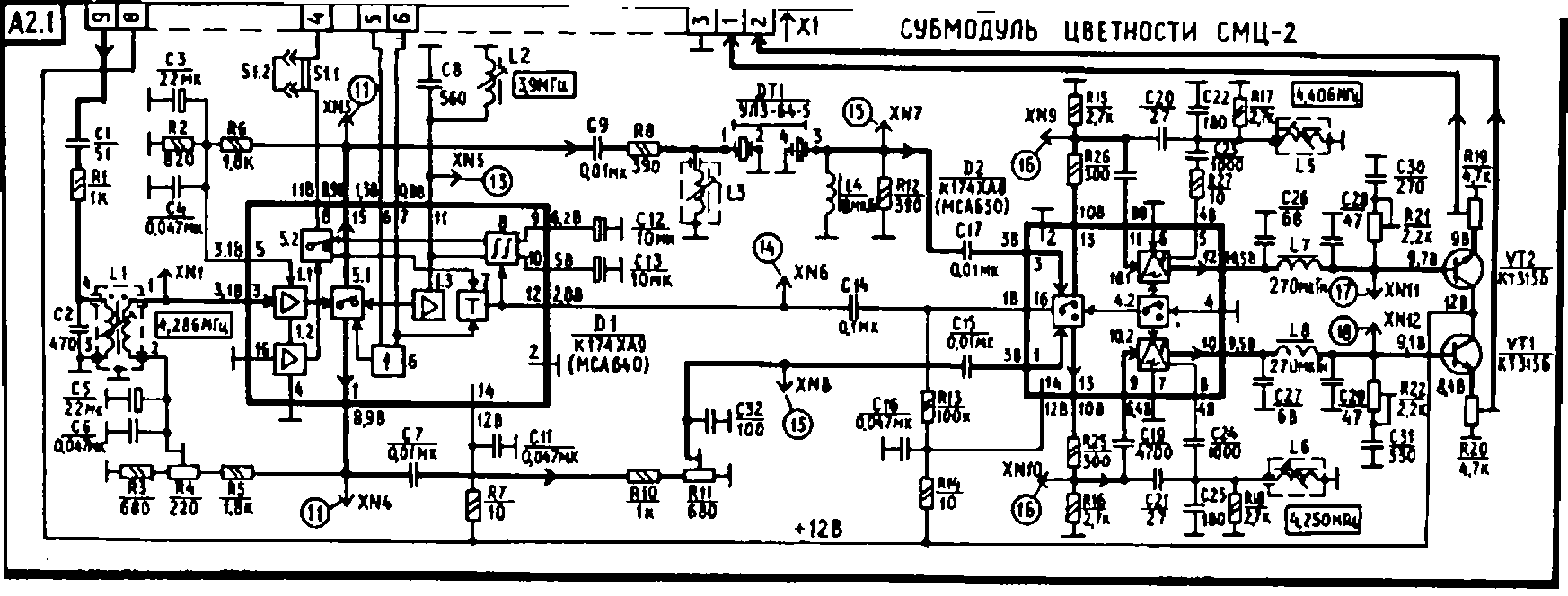 Ten modul se vrazil místo původního SECAM modulu, umí jak PAL, tak SECAM. Sám si podle identifikace přepne i charakteristiku vstupní propusti buď na PAL-filtr, nebo SECAM-cloche. Funkce NTSC 4,43/3,58 není zapojená, i když ji dekodér umí taky.