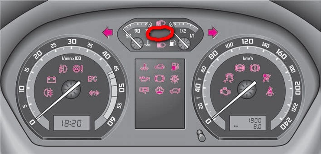 Dnes jsem si stačil všimnout, která kontrolka to je, ale piktogram jsem nestačil zaznamenat - je to červená pod kontrolkou potkávaček.
