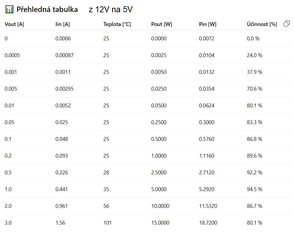 Tu tabulku vytvořil GPT, já si jen pro sebe zkoušel na zátěži kolik obvod bude žhavit, do jakého proudu je použitelný, jestli neshoří a tak, abych věděl kde ho mohu v budoucnu požít a kde ne, a při té příležitosti jsem si hodnoty zapsal do txt. K spočítání účinnosti a zformátování do srozumitelnější tabulky jsem použil AI a tohle je výsledek Smile Moc jsem to nekontroloval.