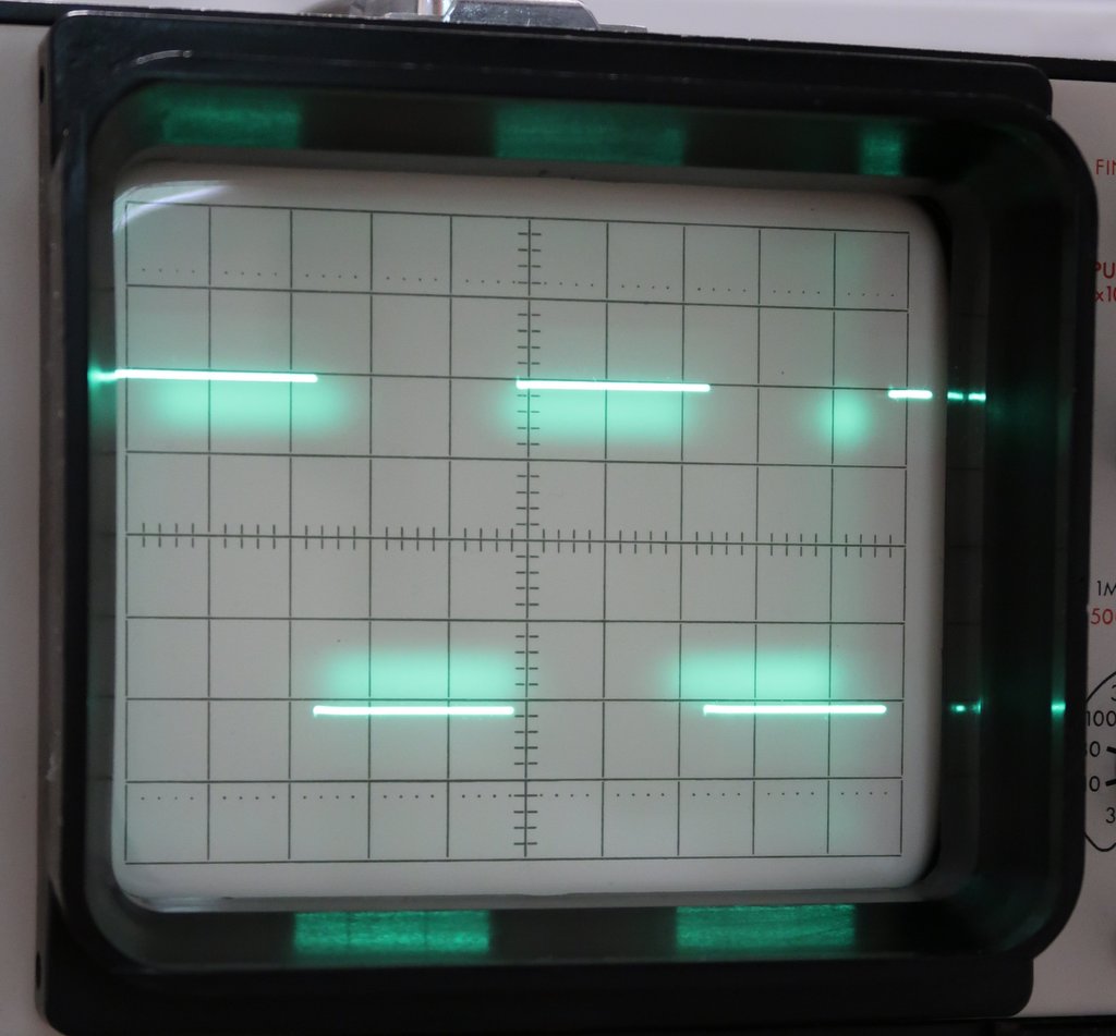 Jediná vada na kráse, je zřetelné hallo okolo signálu při vyšším jasu. Signál na vychylovacích destičkách a zatmívací impulsy jsou naprosto korektní a stejnosměrné složky odpovídají manuálu. Zkoušel jsem hýbat s VN, různé kombinace nastavovacích prvků obrazovky, ale nemá to na to žádný vliv. Buď je to normální vlastnost té obrazovky (asi ne) a nebo možná někdy dostala ránu a něco se v ní hnulo. Nejvíce je to vidět na posledním obrázku s pravoúhlým průběhem.