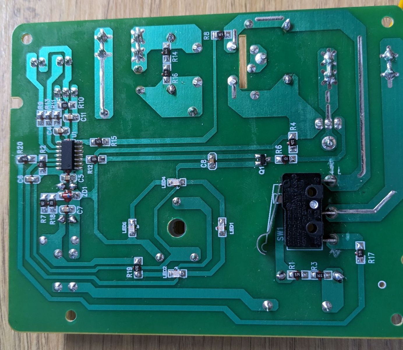 SW1 ...> R17 ...> R20 ...> bezpečnostná funkcia blokuje rozbeh. Najprv sa SW1 musí vypnúť, až potom zapnúť.