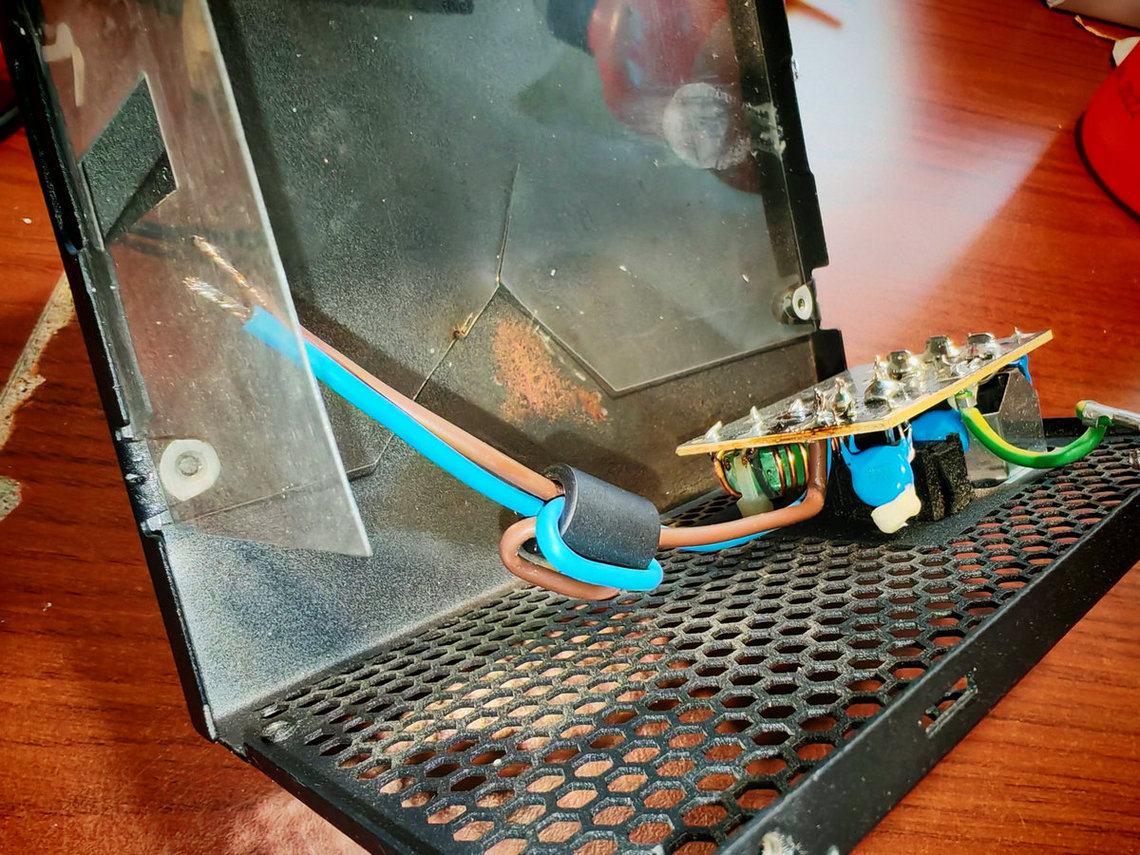 Spolu s žltým kockatým kondenzátorom (vedľa poistky) a kapacitou vedenia (či kapacitou v iných spotrebičoch) vytvorila tá cievka seriový rezonančný obvod naladený na nejakú vyššiu harmonickú pracovnej frekvencie toho, alebo iného blízkeho zdroja?