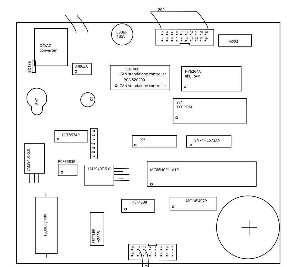 Na schéma desky zapomeň, to nemá ani fabrika. SM tyhle moduly řeší pouze jako celek /A8/, je vidět pouze jeden kabel (napájení + CAN?). Ačkoliv jsem tyhle retro stroje osobně nezažil, myslím si, že než "vykradené součástky" to bude spíš rozsypaný soft. Kombajnový monitor v původní stavu nedělá vůbec nic?