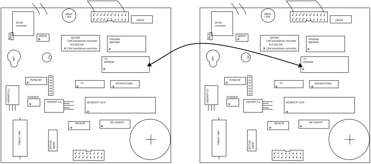 Myšlenka rychlé opravy byla: vytáhnout z desky "A" IC EEPROM chip a strčit jej do podobné "zdravé" desky "B". Tohle jsme vyzkoušeli. Výsledek? V desce "B" byl na displeji "ERROR SOFTWARE". Tohle mě přivedlo na myšlenku, že firmware si nějak sahá i do On-chip EEPROM v MC64HC11...