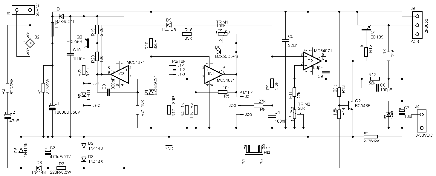 To je několikrát provařený schéma, navíc je v něm několik nesmyslů - například pro výstupní napětí AŽ 30V to nemůže bejt "krmený" stejnýma 30V i na vstupu, to by prostě ten výkonovej sériovej tranzistor neměl z čeho regulovat. Na vstupu takovýho zařízení musí bejt takový trafo a usměrňovač, který dají aspoň o 2-3V i při plným proudovým zatížení, tzn. NEMŮŽE TO BEJT sekundár s efektivním napětím nižším než cca 32V - a v ten moment se ale špičkový napětí naprázdno po usměrnění na kondíku C4 (sběrnej filtrační "kýbl" 4700uF) spolehlivě překročí maximální napájecí napětí použitýho 4násobnýho OZ = vyleze až kamsi ke 45V ... _________________ Nasliněný prst na svorkovnici domovního rozvaděče: Jó, paninko, máte tam ty Voltíky všecky...