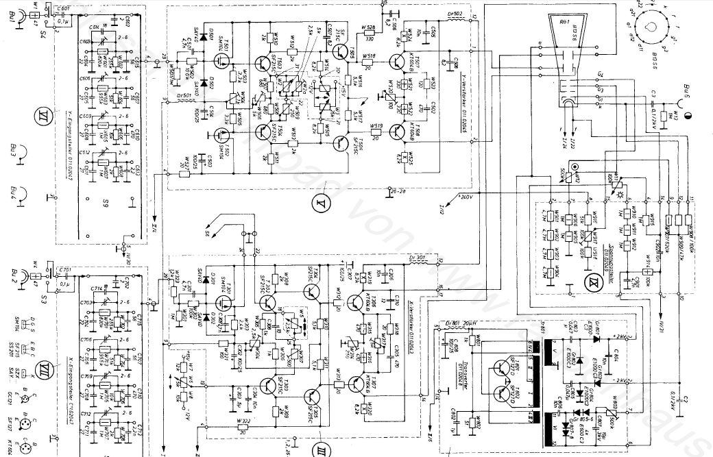 Abys dostal uprostřed obrazovky bod, musí být na kolektorech koncových tranzistorů obou zesilovačů zhruba polovina napájení, tzn. kolem 120V. Zkontroluj, jestli je v pořádku zdroj 240V a pak napětí na kolektorech T507 a T508 a dtto i T306 a 307. Samozřejmě za předpokladu, že ostatní elektrody obražofky mají potřebná napětí . Aby např. nebyly vakly v potenciometrech jasu a ostření paprsku (na g1 má být proti zemi asi -25V a na g3 asi +450V).