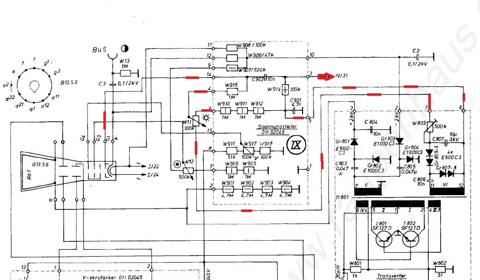 Pro další hledání zkus doplnit, jaké napětí vyrábí zdvojovač z vinutí VI (vývody 6 a 7 měniče) - a pak na jakém potenciálu jsou "opřené" v obvodu zhášení. To je ten bod IX/3. Protože v obrázku cos předtím vlepil to vypadá, že obvod zdvojovače a řízení Ug1 jsou plovoucí a přes W914 se (asi) o něco opírají. Bude potřeba měřit opatrně, je to asi posazené na vysokém napětí, katoda obrazovky má (měla by mít) -2 kV proti zemi! A určitě bych zkontroloval svod C3, C901 a C902...