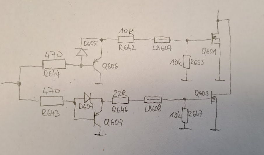 Ale podel toho, že to není připojeno na +V, ale jen do gate Q601 a Q603, tak to budou fakt asi bipoláry.