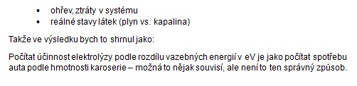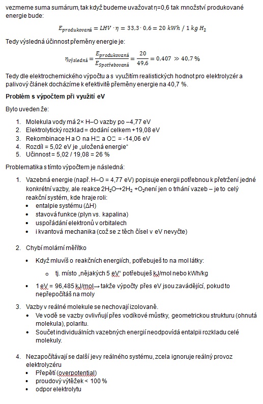 Pokud počítáš účinnost elektrolyzéru v eV na vazbu, ale ignoruješ přepětí, proudový výtěžek, a že v reálném světě pracuješ s moly a watthodinami, tak to můžeš klidně