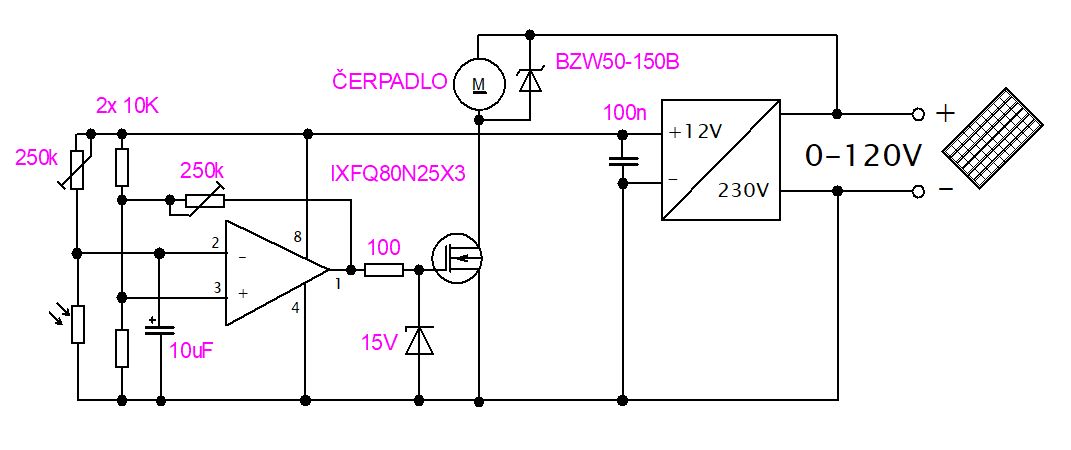 Zdravím. Než začnu tvořit tištěný spoj, mohl by se mi někdo kouknout na ideový návrh ovládání čerpadla bazénové filtrace? Jedná se o čerpadlo ze stejnosměrného motoru, který je napájen 3mi solárními panely. Jde o to, že potřebuji, aby se ten motor sepnul až v okamžiku, kdy na něm bude dostatečný výkon z těch solárních panelů. Obdobný obvod s fotorezistorem a komparátorem mi tam funguje s relátkem, ale díky tomu DC proudu se opalují kontakty. Chtěl bych to upravit na spínání tím tranzistorem. Odběr motoru je cca 3A, napětí na panelech do 120V. Může být ten mosfet takto zapojený? Přežije to když ho přišroubuju na chladič?