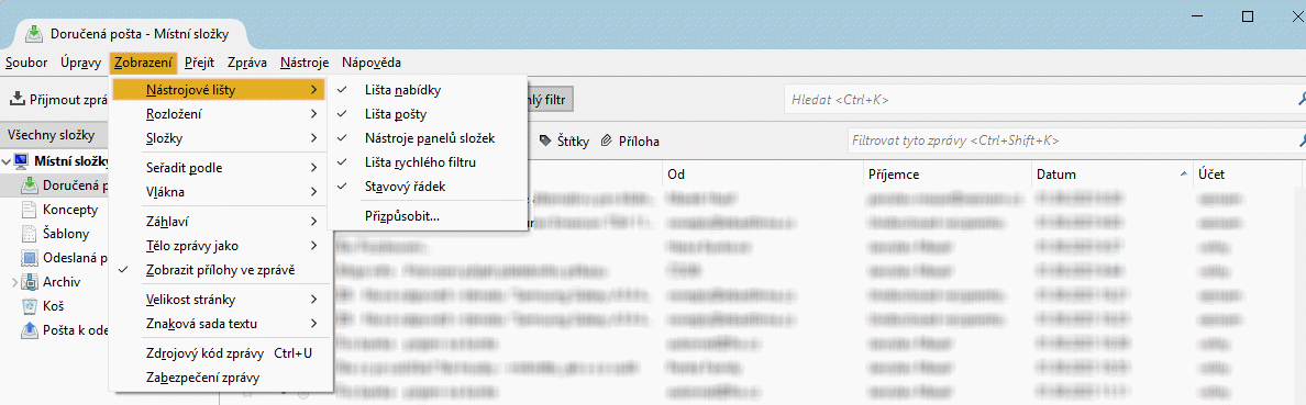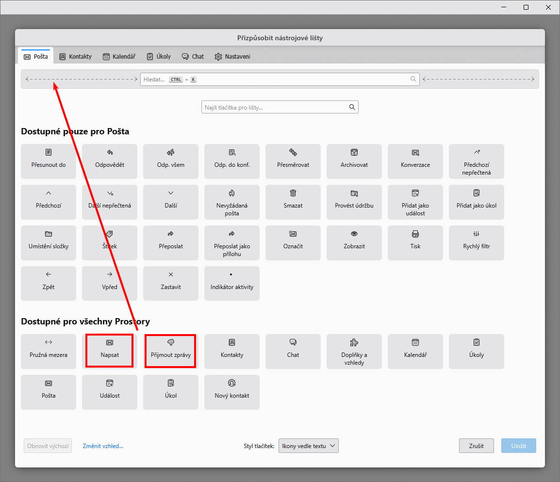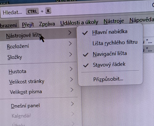 Dík za rady, už je vše OK. Ten fígl s přetažením ikonek do horního řádku v okně Přizpůsobit mě nenapadl. Já jsem jen blbě nazval ikonku Přijmout zprávy slovem Přečíst.