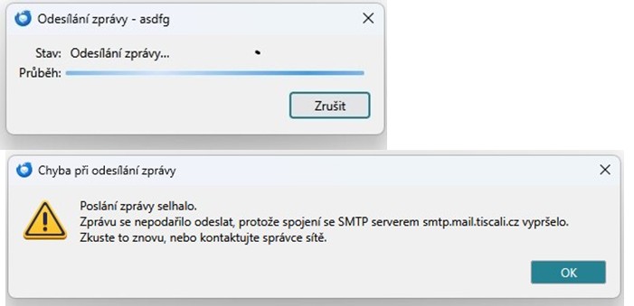 Maily mohu zatím bez problému odesílat přímo z mého účtu na stránkách tiscali.cz. Příjem mailů v Thunderbirdu funguje bez problémů na všech adresách, kam zprávu pošlu.