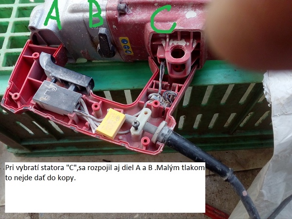 Bracho nie.Robim taketo vercajky desiatky,viem o com pises.Najprv som vybral uhliky,potom dal dole celu rucku s vypinacom,odpojil z vypinaca droty do motora. Az potom som chcel oddelit diel "C" od A a"B" Vtedy sa to rozletelo na tri casti.Je tam tlak,nieco musim uvolnit len neviem zatial co .Nemam cas sa s tym vela zabavat.Taketo presne vacsie som robil generalky,tak som ich rozoberal inac. Su tam uhliky 6,5 X7,5 mm.Zozente si ich su v mnohych priklepkach nad 1000W.Este raz ,diel A a B nejde spojit dokopy!Teda ani bez statora a rotora. _________________ Zbieram hlavne nefunkčné náramkové hodinky PRIM,prípadne rôzne opravím.