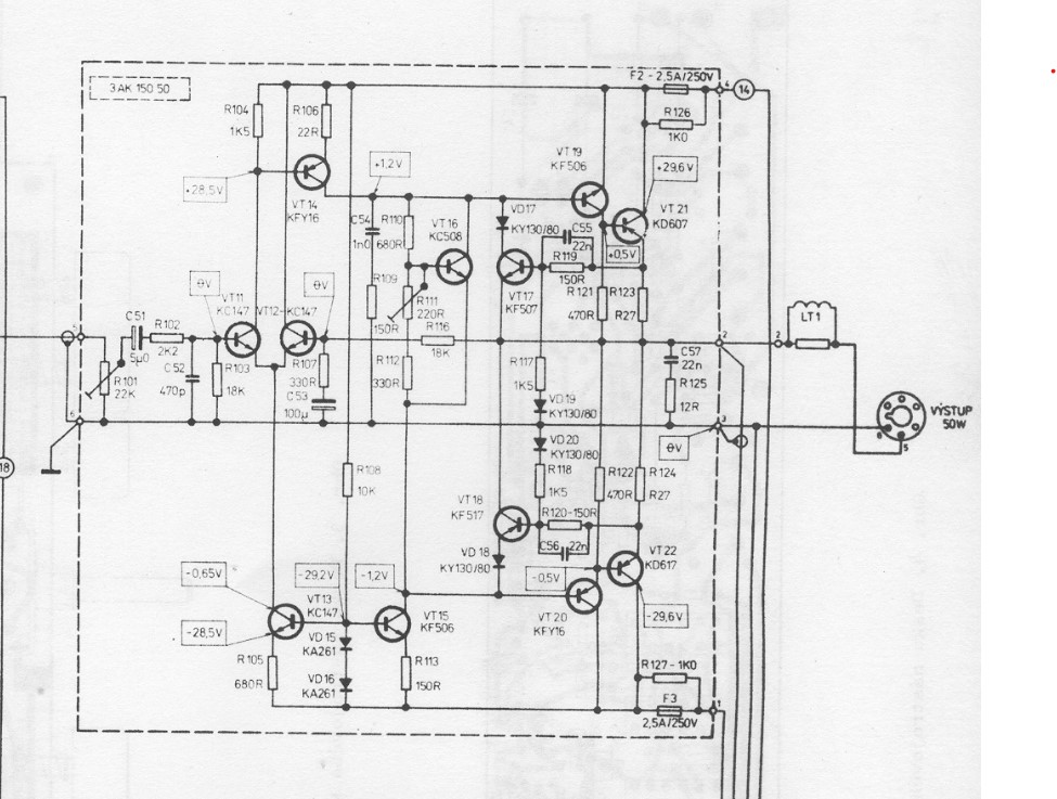 Koukal jsem na zapojení koncového zesilovače AZK051, na které jsem přišel přes již neexistující stránku zosilnovace.eu, protože zrovna potřebuju nějaký nenáročný zesilovač, a chtěl jsem ho postavit s KD606 a KD616 (mám jich kupu) místo KD607 a KD617. Po větším prohlížení jsem zjistil, že na napájení cca. +/- 32V by použití těchto tranzistorů bylo riskantní.