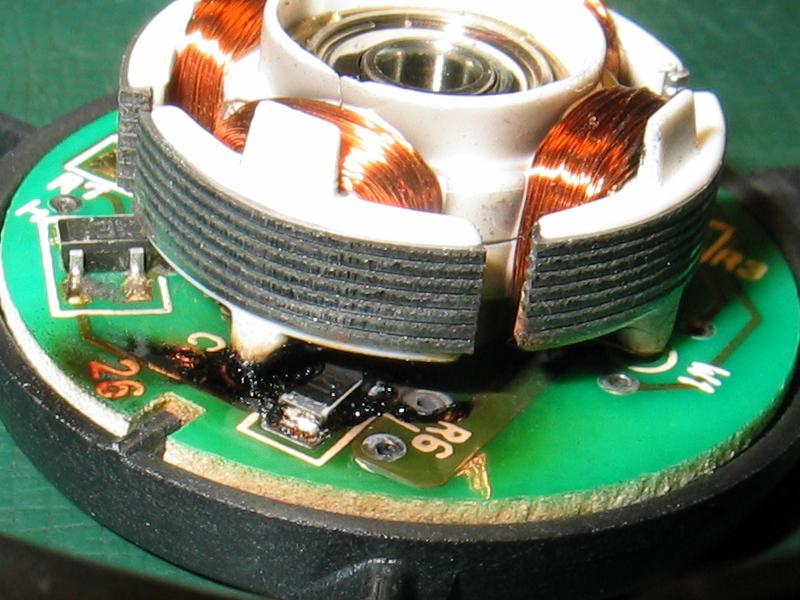 Rozobral som teda ventilator, aj tak je zrely na vymenu lozisiek. Je to SANYO DENKI 109X7612T5S03 - box chladic od P3 Tualatin. Vidiet tam spaleny odpor od jedneho vyvodu IO. Ventilator pritom normalne funguje, pri 12V zerie 0,14A (na stitku je 0,17A).