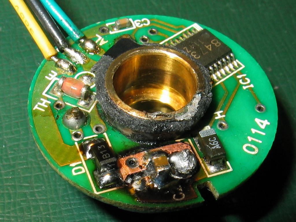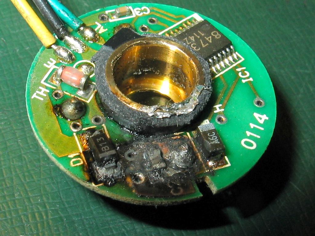 Pouzitim mierneho nasilia (stahovak na loziska) som vytlacil - vylomil - cely stred z plastu. Zjavne sa to zacalo palit zospodu. Stale mi nie je jasne, co sa tam vlastne stalo.