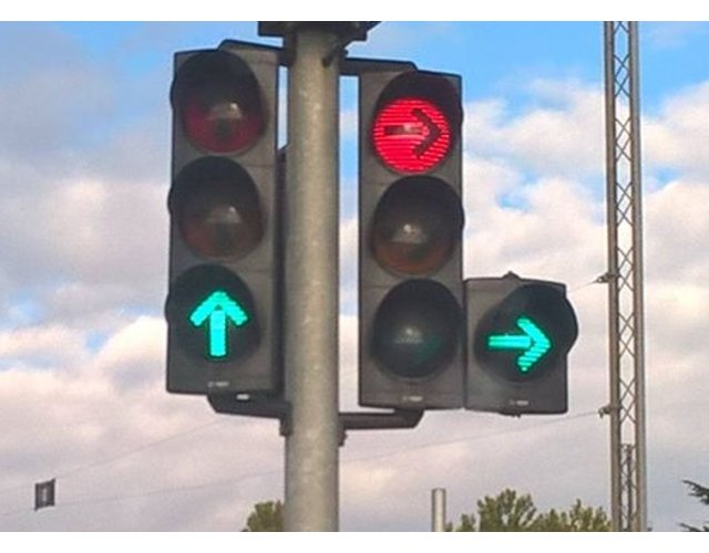 Križovatka má 3 jazdné pruhy, každý pre jeden smer. Podľa mňa je tento semafor silne mätúci. Za zníženej viditeľnosti to môže vyzerať ako zelená šípka vpravo pre pravý jazdný pruh, v tom prípade by vodič prednosť nedával a mohol by spôsobiť nehodu alebo zraziť chodcov. Keby bola zelená šípka vo výške plnej červenej, bolo by to jasné.