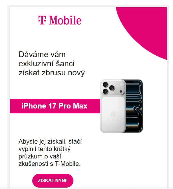 Zaslal: st říjen 15 2025, 11:34 Předmět: Také jste dostali podvodnou nabídku T-mobile na iPhone?