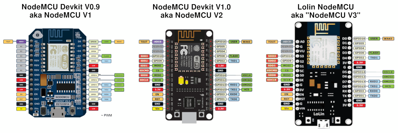 Na moduloch možno vidieť vygravírované označenie ESP8266MOD, alebo ESP12 s príslušnou príponou, ďalej logo Espressif, Ai-Thinker, alebo aj kdejaké iné.