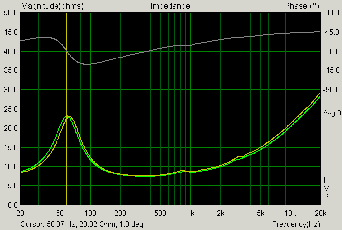 Na obrázku je typický průběh impedance u 6,5" středobasu. Dva hrbolky na vyšších frekvencích jsou nějaké parazitní rezonance membrán. Nahoře bíle je průběh fáze, žlutá a zelená křivka jsou pro dva kusy stejného typu.