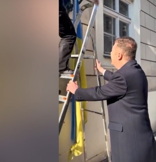 Osobně držel štafle. Okamura nechal sundat ukrajinskou vlajku z budovy Sněmovny