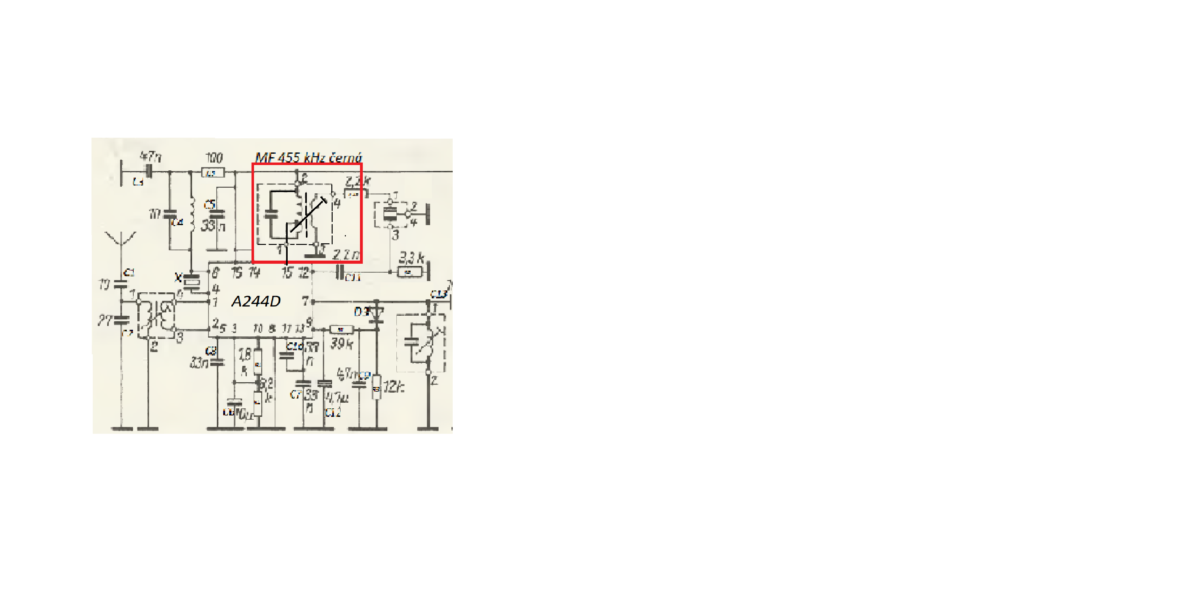 Myslím, že zapojení mf zesilovače Fr. Svíčky a jiných starších RC přijímačů nelze použít jako vzor, protože tady v tom zapojení není to černé trafo ve funkci mf zesilovače (ten je celý obsažený v IO A244D), ale je spolu s keramickým filtrem 455 kHz použité jako pásmová propust kvůli selektivitě.
