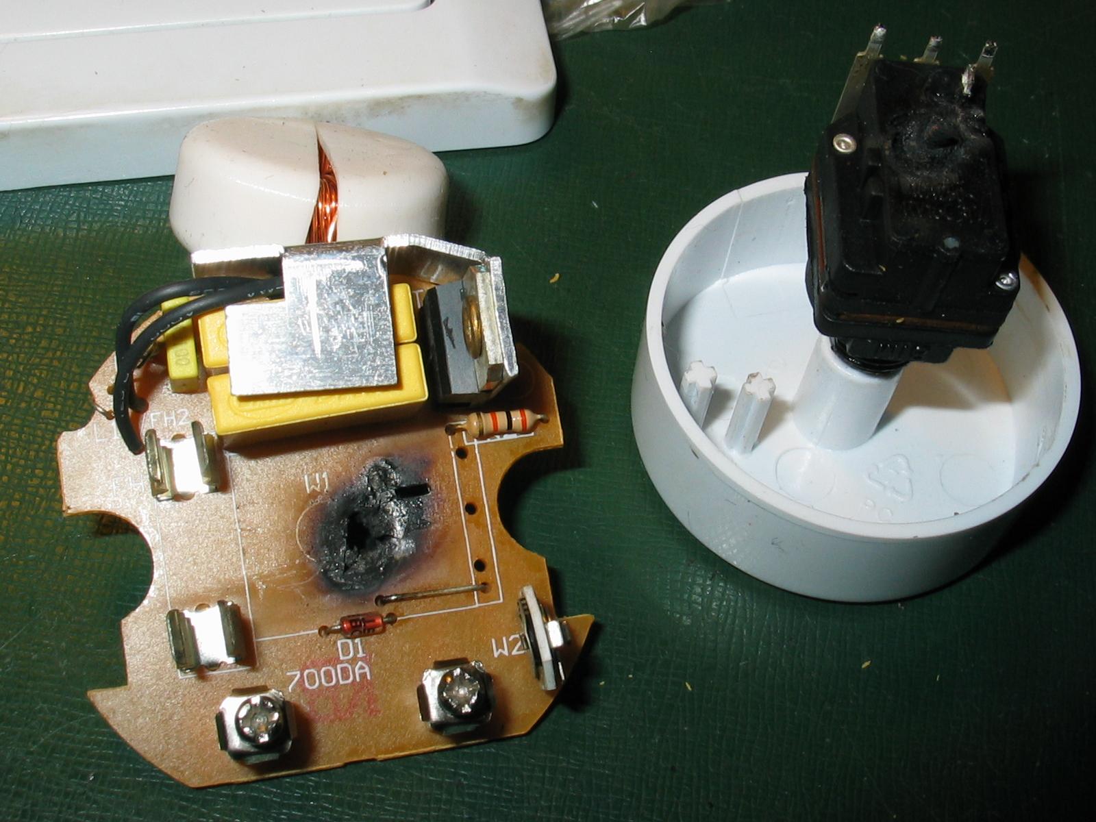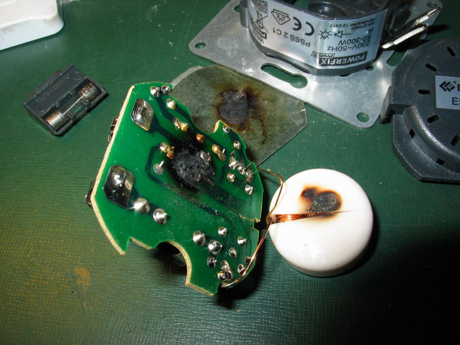 Stmievac Powerfix PSSS 2 C1 - preznaceny cinsky EverFlourish EFO700DA. Krasne prehorel plosak aj s vypinacom a cez izolacnu podlozku takmer az do cievky.