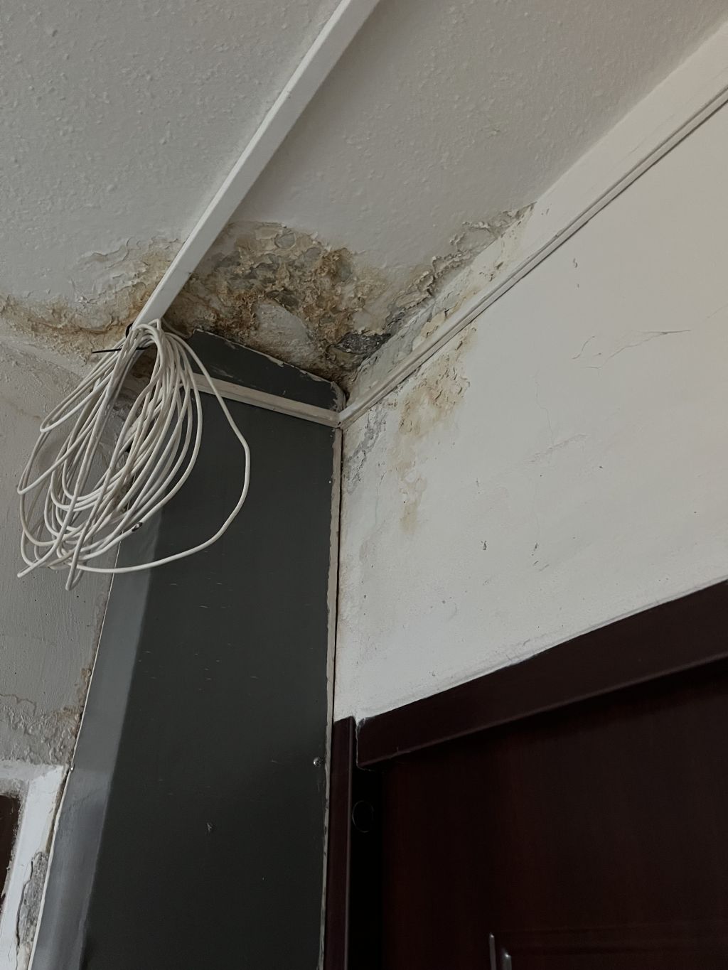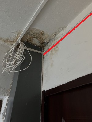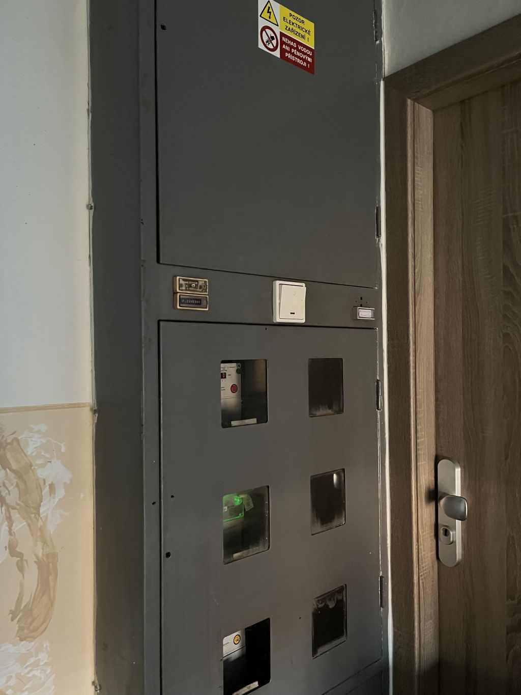 Je to panelák, tzn. od rozvodnice na chodbě to jde do bytu bezprostředně přilehlýho (napravo od vejtahu) přímo průrazem v panelu do "pé-elky" nade dveřma, do případný garsonky a bytu naproti = nalevo od vejtahu je taženej kabel v husím krku zalitým do toho stěnovýho panelu nalevo od rozvodnice, malej kousek pod stropem. Bez toho husího krku by tam kabel po sestavení baráku nikdo nedostal, řezat do panelu vodorovnej šlic a kabel tam zamatlávat maltou by si za komančů nikdo nedovolil. Ten plechovej kryt na posledním obrázku (a s plesnivým stropem kolem) kreje okapovou rouru, která je v takovým paneláku standardně vedená vnitřkem. Ten husí krk je přibližně v místě červený čáry na obrázku, možná o pár cm vejš.