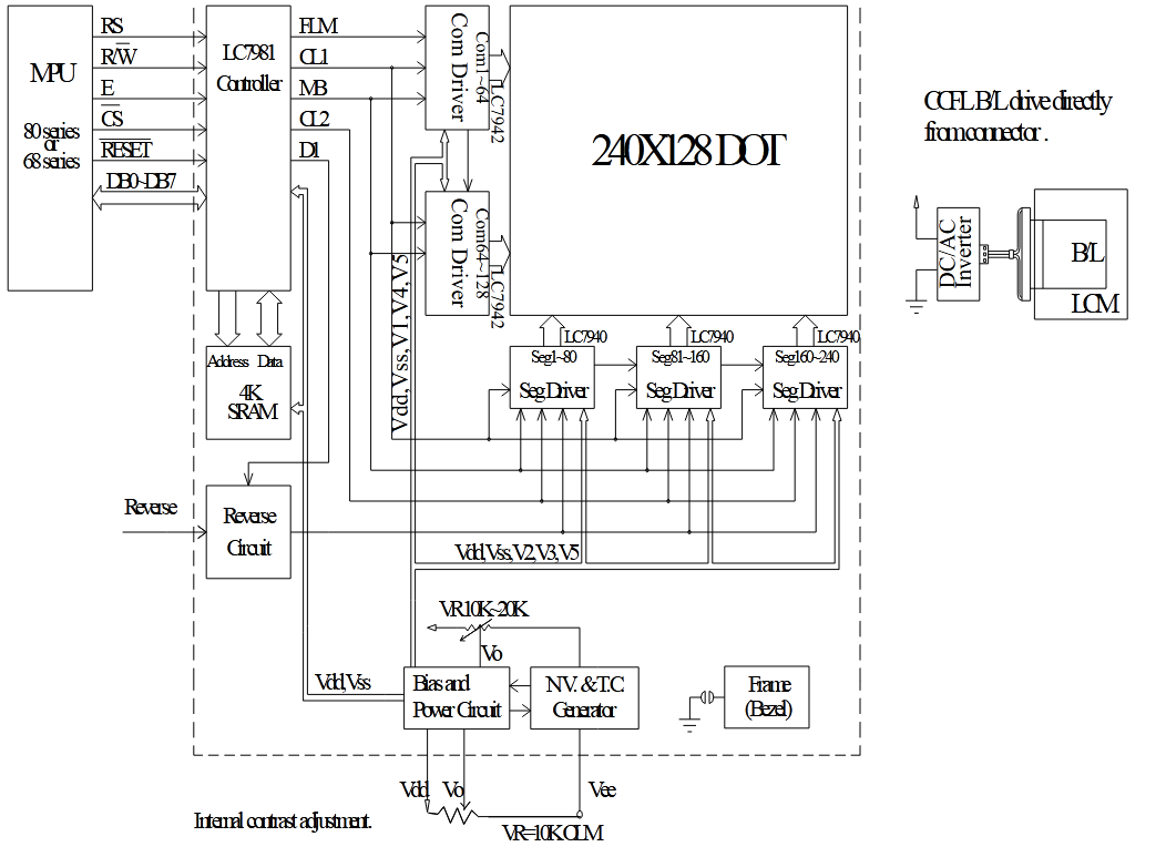The LCM has built-in a LC7981 LSI Controller, it stores display data sent from the 8 bit microcomputer in the display RAM attached externally and generates dot matrix LC drive signal. The LC7981 has two modes-the graphic mode, in which each bit of data from the external RAM either lights or doesn’t light a dot in the LCD, and the character mode in which character codes stored in the external RAM generate dot patterns through the built-in character-generator ROM (CGROM)