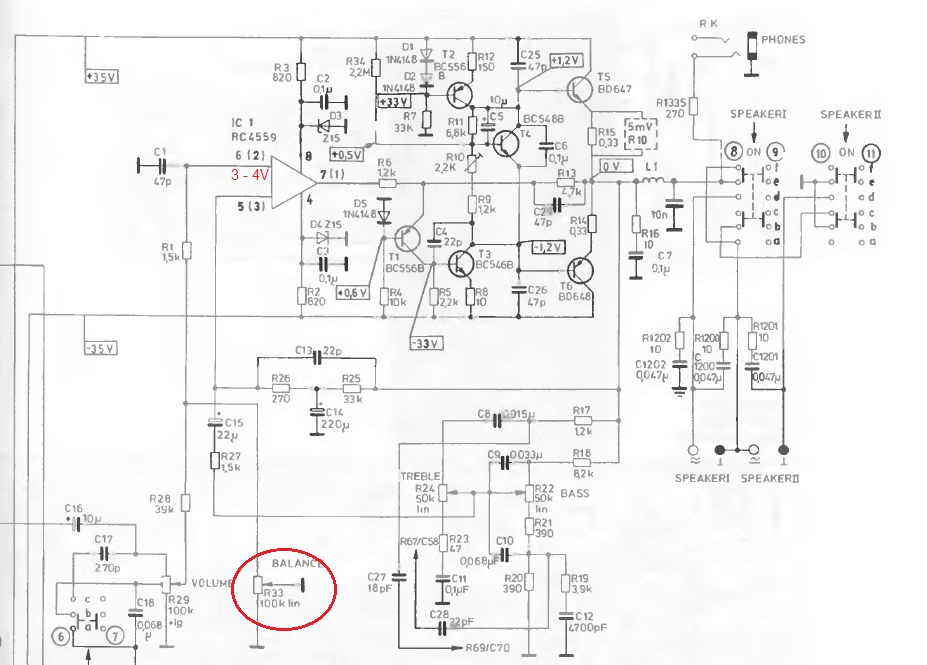 Mám rozdělaný tenhle zesilovač a po řadě měření jsem se dopátral k tomu, že nejspíš zdechnul IC na vstupu, viz přílohu. Zesilovač měl na tomto kanálu offset -35mV a klidový proud nastavený podle předpisu na 5mV na emitorových odporech. Byly v něm přerušené pojistky 2,5A od trafa, začal jsem tím, že jsem ho krmil z externího zdroje postupně zvyšovaný napětím, vše vypadalo O.K. ovšem po dalším zapnutí začalo rachotit v repro, takže jsem to vypnul a měřil, při symetrických 35V je na výstupu - 34V, při symetrických 22V je tam kolem 10V. Na vstupu IC za R1 je trvale záporné ss napětí proti zemi i když R1 přes potenciometr BALANCE uzemním. Z toho jsem usoudil, že zdechnul IC1 .... ?