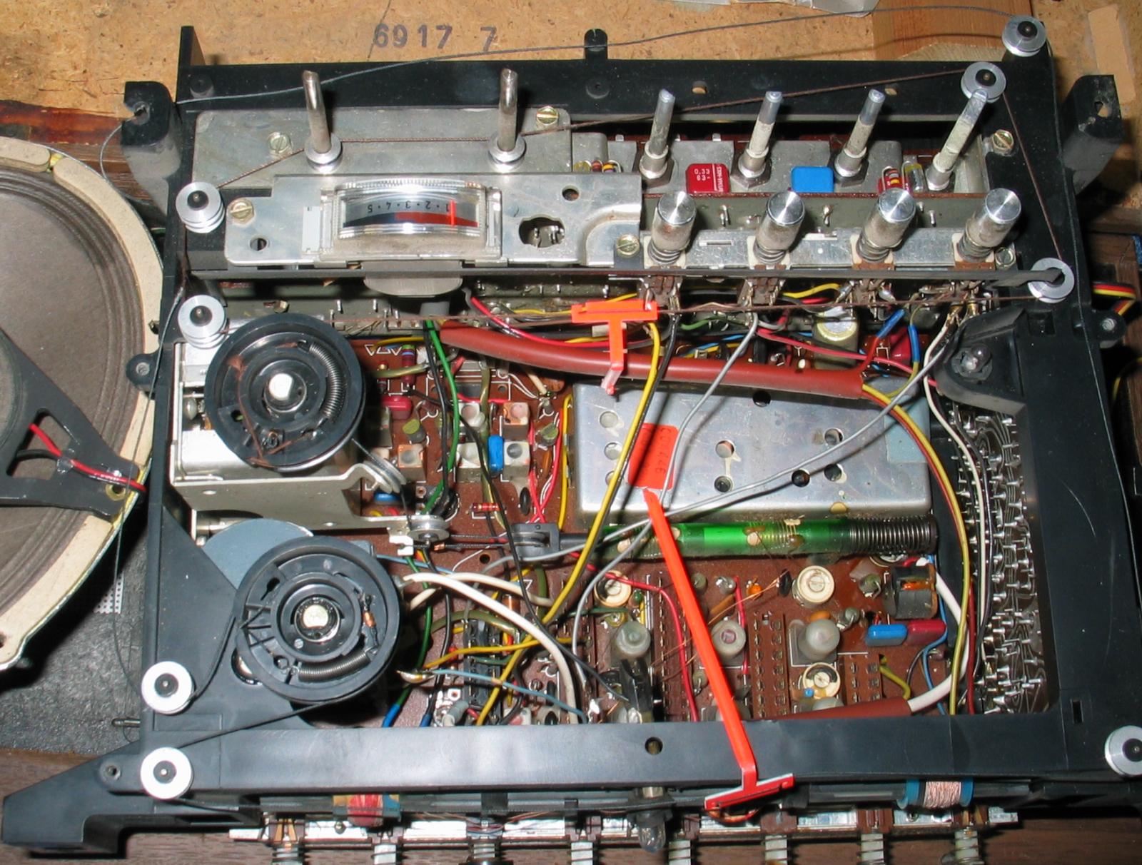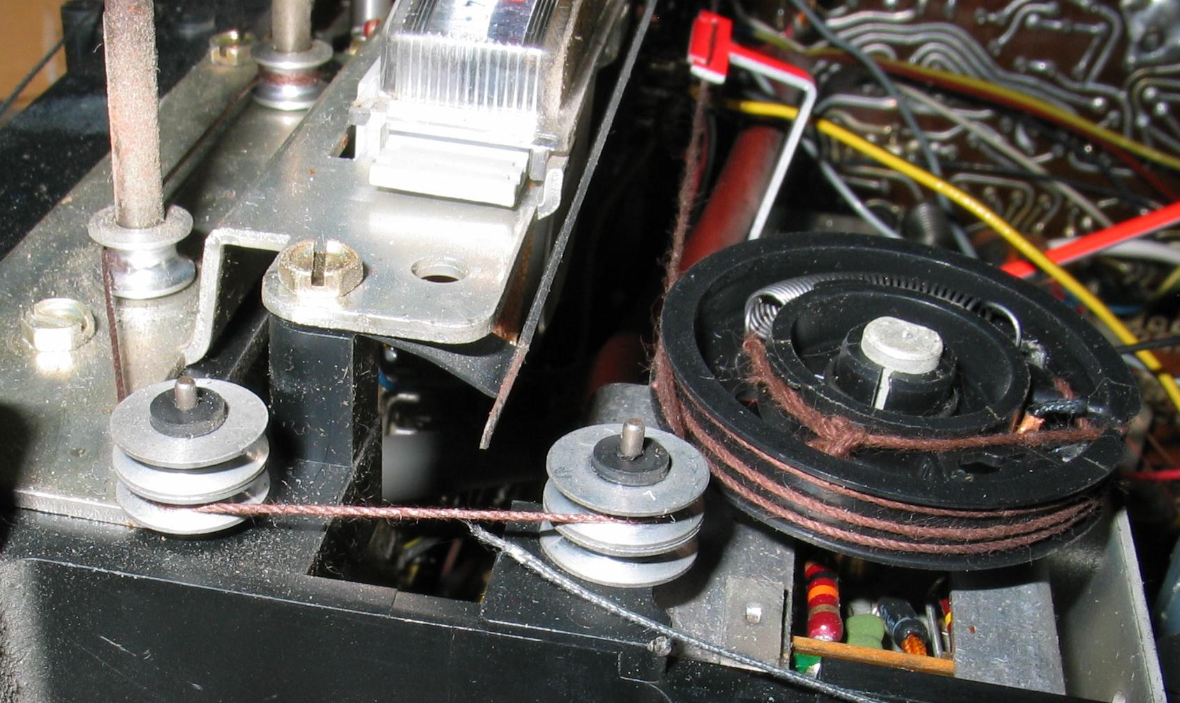 FM funguje (na fotke horny ladiaci kondenzator, prave "tocitko"). Neviem, ci ide lanko spravne - dotyka sa druheho "tocitka" a nasledne ide cez dve remenice v roznej vyske.