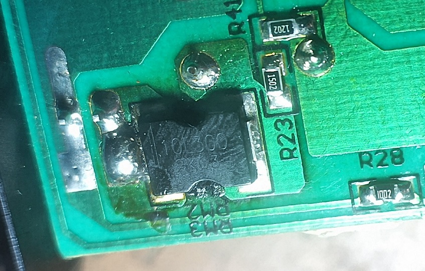 Prosím o pomoc s identifikáciou súčiastky na foto. Je to v nabíjačke elektrovehiklu, zapojené v zápornej vetve výstupu zrejme ako snímací rezistor. Označenie na púzdre 10L300, pod tým 2K03. Odpor teraz zhruba 2 MOhm. Dal by som tam odpor 0R2 ale mätie ma púzdro, prečo má pásikom označený jeden pól, na foto ľavý. Z druhej strany DPS je čierny vypálený fľak, takže dostáva tepelne hodne na prdel. Čo to je ?
