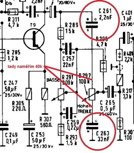 Zjistil jsem, že byl vyměněn potenciometr výšek za menší, viz obrázek. Chtěl by to do pondělí, vidím dvě cesty - omezit rozsah regulace výšek přidáním odporu cca 27kΩ do série na každou stranu dráhy, NEBO změnit C261 a 263 a tady jsem ztracen, jak to přepočítat?