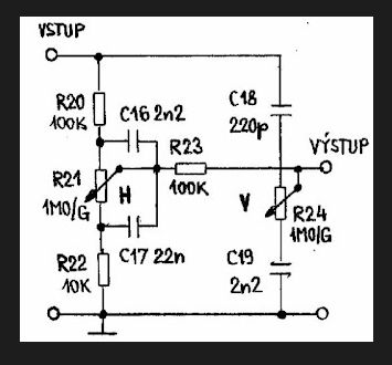 Pána přesvědčím, že by bylo nejlepší vyměnit potenciometr za jiný ale až časem, bude to asi potřebovat i ten na hloubky a 300kΩ už neseženu vůbec. Nehledě na to, že zde byly (a na hloubkách je) použity dvojité potenciometry, tedy korekce každého kanálu je možno ovládat nezávisle.