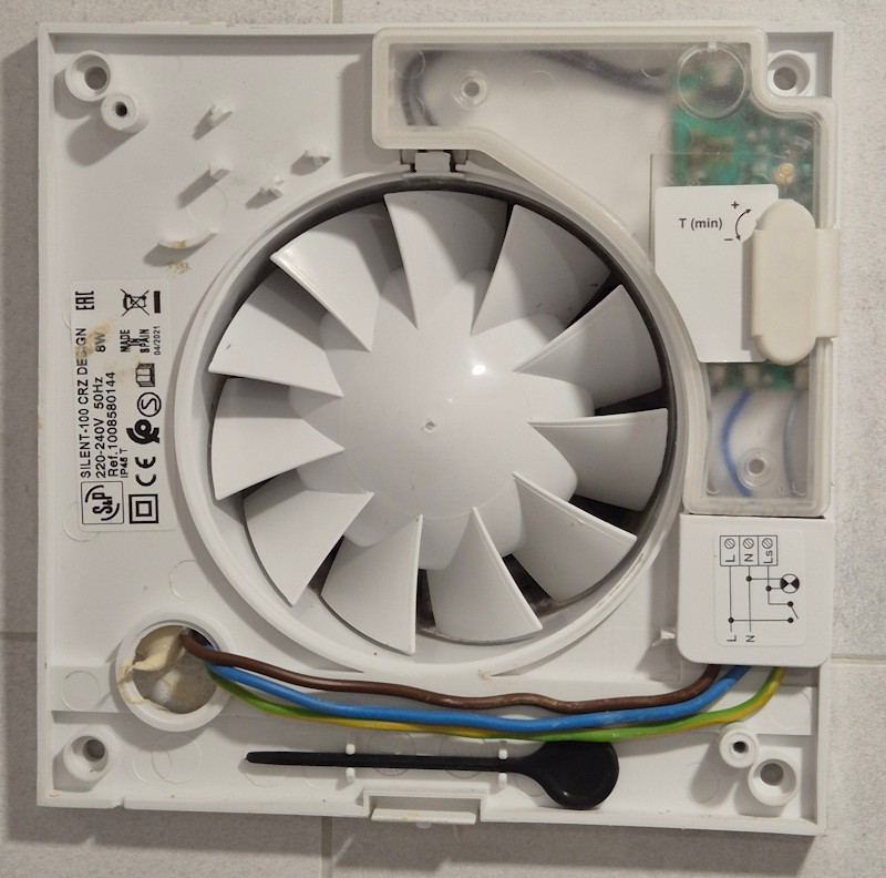 Větrák má vstupy: L (fáze), N (nulák), Ls (signální vstup pro časovač).