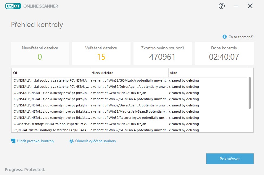 K mému překvapení ESET skončil práci za necelé 3 hodiny. Našel a vyléčil 15 hrozeb. Překvapuje mne, že Defender prohledával miliony souborů a ESET jen 471 tisíc.
