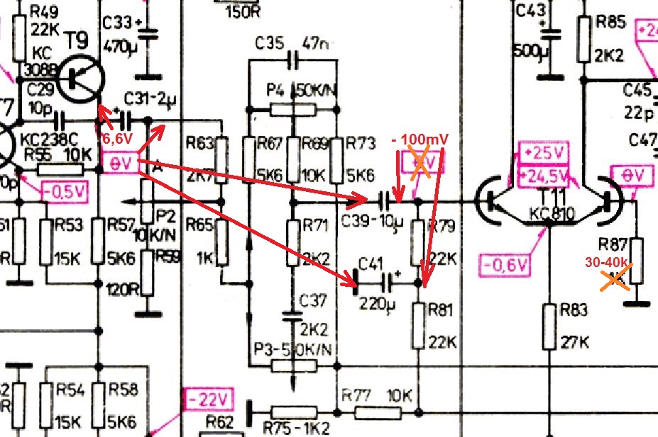 Tady bývá na výstupu offset kolem 100mV a víc, málokdy menší. Náhradou R87 (a příslušného v druhém kanále) je offset kolem 15mV. Nevím jestli to souvisí, mám tu další desku napadenou kutilem, po zprovoznění doplním další údaje naměřené bez úpravy offsetu. Na C31 je při napájecím napětí ±27V 6V, to je v pohodě, ale C39 a C41 jsou TRVALE polarizovány záporným napětím cca -100mV, měřeno na vývodech kondenzátorů. Přitom to funguje tak nevím, co si o tom myslet.