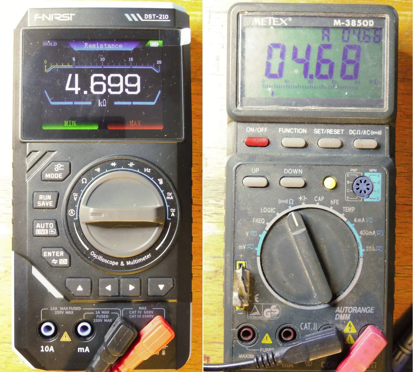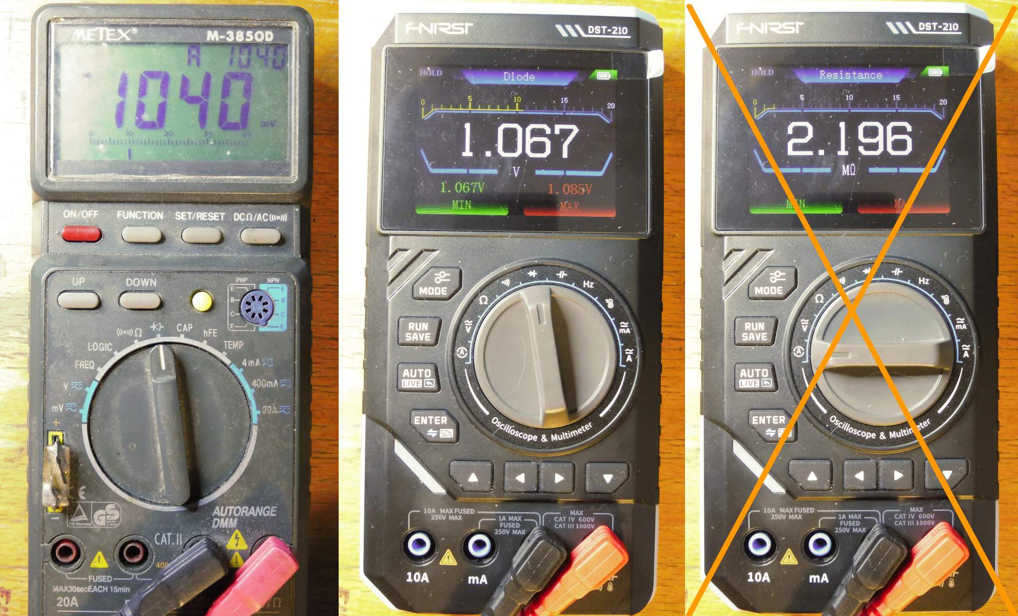 Začnu tím multimetrem - je do značné míry inteligentní. V režimu AUTO rozeznává, zda měří napětí stejnosměrné, nebo střídavé, proud i odpor. Naproti tomu pro test diod nezbývá, než na něj přepnout ručně, jinak je interpretuje, jako odpor. Na snímkách je napětí na LEDce v optočlenu PC817 při 1,5 mA (Metex), resp. 1,58 mA (DST-210).
