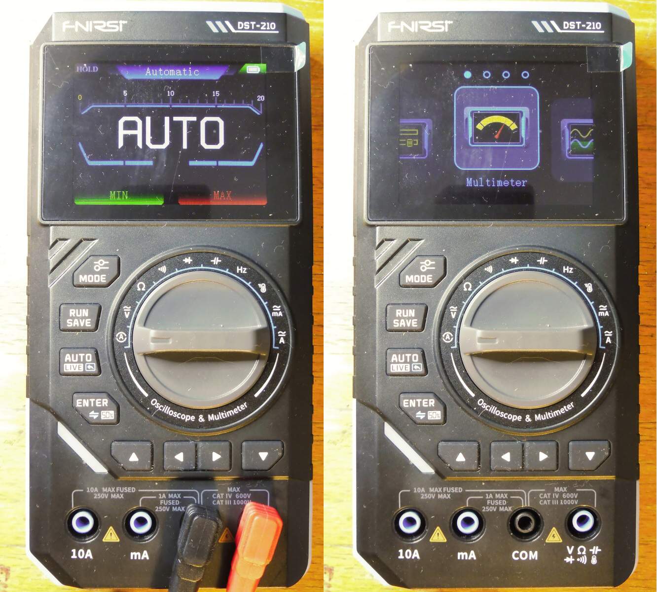 Takže k přístroji: po startu spínačem na boku naskočí multimetr v automatickém režimu. Tlačítkem MODE se dá zařadit funkce osciloskopu nebo signálního generátoru.