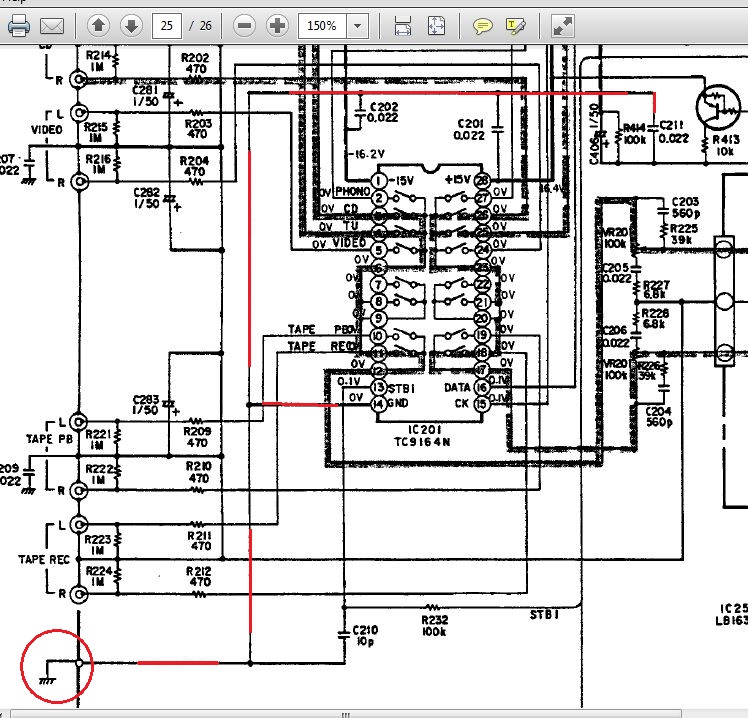Určitě tam nevidím na kostře zem vstupů. Ta je kostřená přes malé kondenzátory. Červeně máš označenou zem ovládací logiky přepínače vstupů.