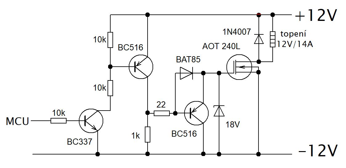 Jedná se výkonový spínací obvod pro topné těleso 12V/14A, napájené z AKU 12V. Spínací tranzistor je na 40V/85A 2,6mΩ. BC516 je sice darlinkton, ale mám jich tu krabičku, tak snad v uvedeném zapojení to nevadí. Procesor bude tu teplotu regulovat PWM v kmitočtu cca 10Hz.