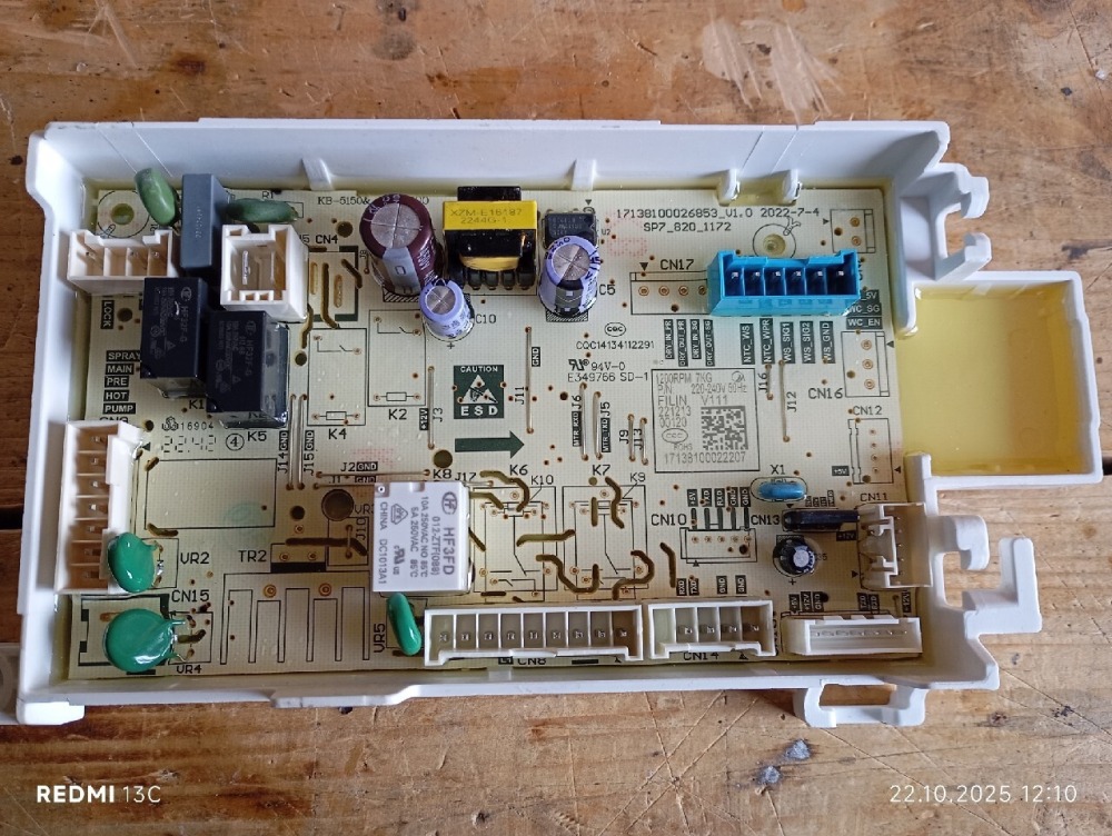 Na DPS jsou 3 relé. 2 malý černý a jedno větší bílý. Při běžícím programu pravidelně cvaká jedno z relé na DPS, frekvence asi odpovídá přepínání směru točení při praní. Když cvakne relé na DPS řízení, tak po chvilce cvakne relé na DPS driveru BLDC motoru bubnu. Jak DPS ovládání, tak DPS driveru motoru jsou zalitý 5mm průsvitným gelem. Nenašel jsem žádný schéma k DPS ovládání a ani k driveru motoru. Motor je řízen asi po sběrnici, na DPS jsou jen popisky (+), (GND), Rx, Tx. Na YT jsem viděl, jak tyhle motory někdo dokáže testovat na stole, ale nikde jsem nenašel žádný zapojení.