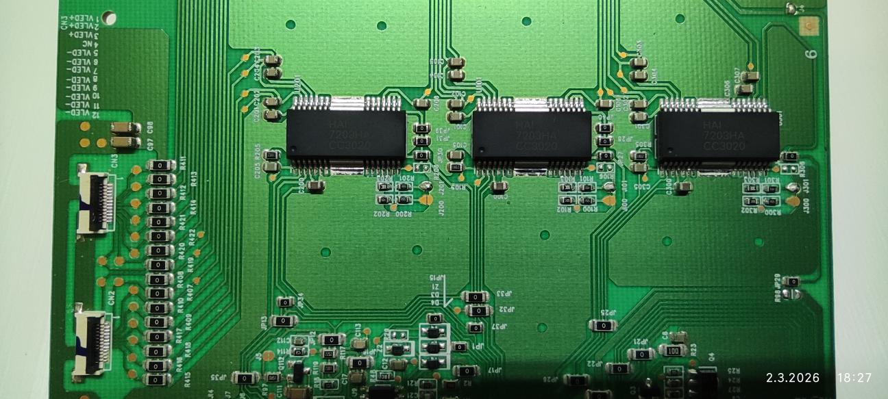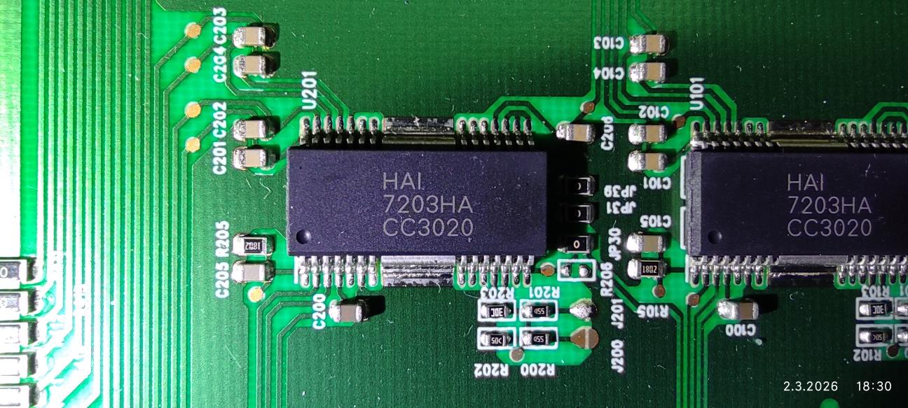 Jsou tam 3ks IO HAI 7203HA, nikde není k nim datashet ale dočetl jsem se že proud by se měl upravit na 12-náctém pinu (ISET) těchto IO úpravou rezistorů, zvýšením jejich odporů se má snížit proud.