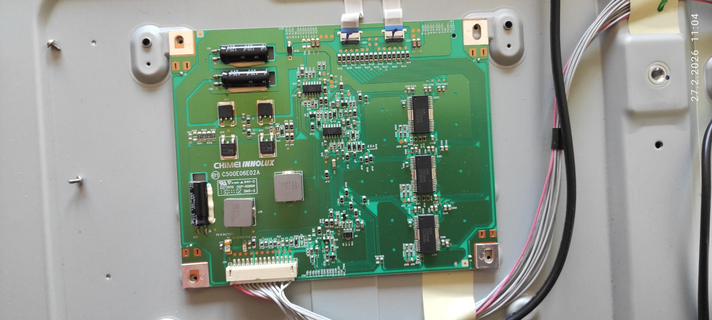 Nyní však bych rád snížil proud podsvícení aby tolik netrpělo, známý jí neměl až tak dlouho a co jsem se díval v menu tak měl podsvícení nastaveno na 88%. Pro řízení podsvícení je tam samostatná destička a výstup je řešen páskovými vodiči což jsem ještě nikdy neviděl takovéto řešení takže již druhý den studuji jakým způsobem se tam snižuje proud.