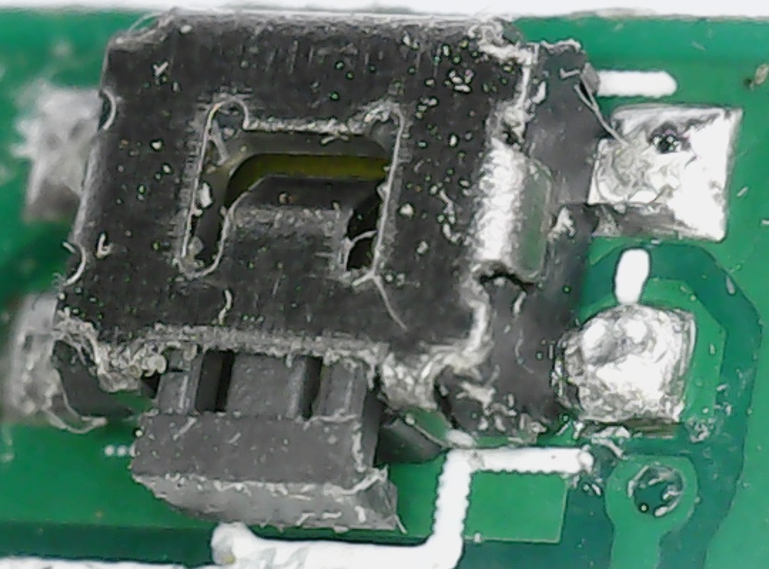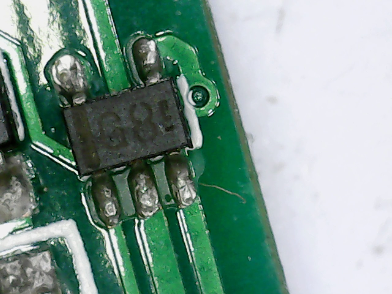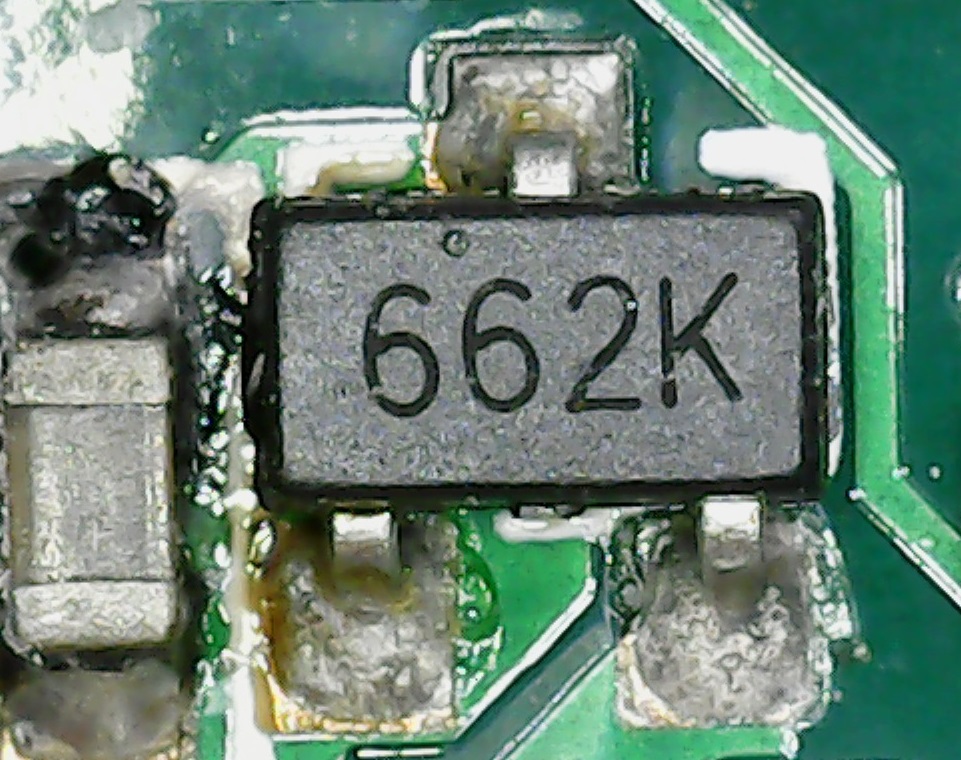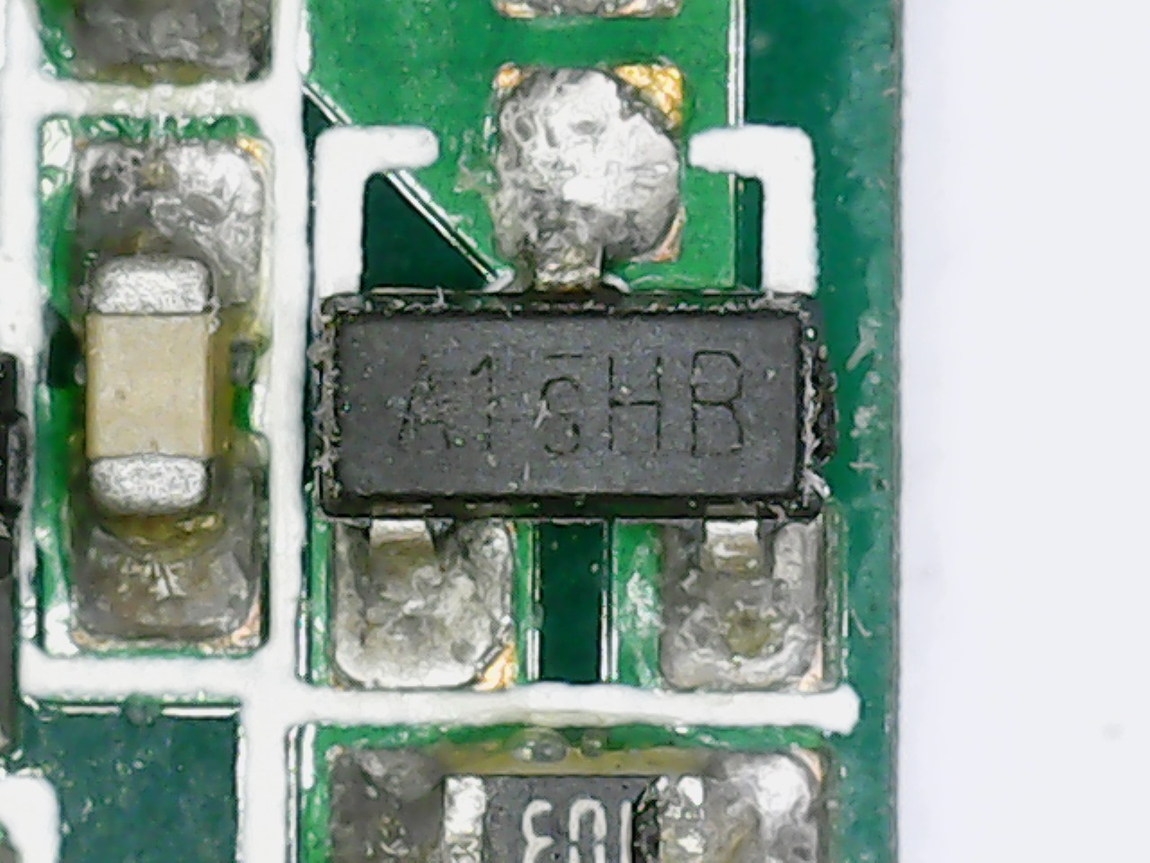 V jednom podvozku je taky odprásklej most motoru. Teda zatím jsem přišel jen na něj, může toho být víc. Zkusil jsem nafotit v mikroskopu SMD pouzdra a zjistit, co to je. Trandy v mostu jsou jasný, dva NPN a dva PNP. Jenže všechny jsou buď švihlý, nebo nekonečno a tak bych potřeboval pomoci s jejich identifikací. Pak tam je ještě něco s pěti nohama, netuším, co to je. Jedinný, co jsem identifikoval je 662K což by měl být stabec 3,3V nejspíš pro logiku řízení mostu.